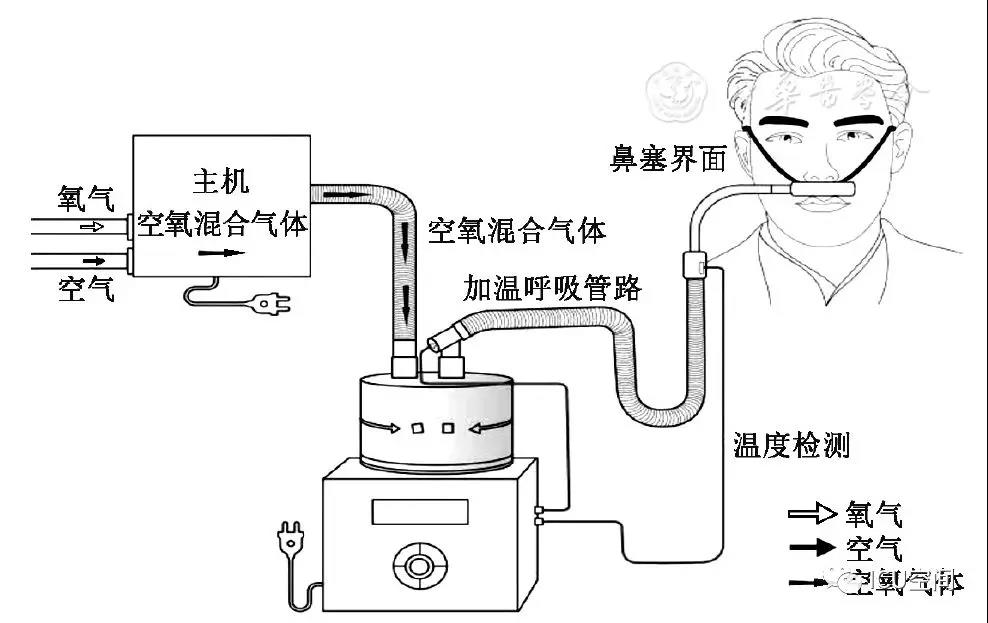 HFNC是指一種通過高流量鼻塞持續(xù)為患者提供可以調(diào)控并相對恒定吸氧濃度(21%~100%)、溫度(31~37 ℃)和濕度的高流量(8~80 L/min)吸入氣體的治療方式。該治療設備主要包括空氧混合裝置、濕化治療儀、高流量鼻塞以及連接呼吸管路[3]。結合國內(nèi)和國際通用命名習慣,本共識統(tǒng)一采用"經(jīng)鼻高流量濕化氧療"進行表述,英文簡稱為HFNC(圖1)。