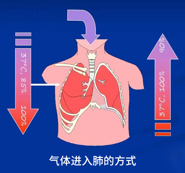 在健康的氣道中,吸氣時,上氣道會對氣體進(jìn)行加溫濕化。當(dāng)氣體到達(dá)肺部時,其溫度為核心體溫并且被水蒸氣充分飽和,也就是典型的,溫度為 37 °C,絕對濕度 (AH) 為 44 mg/L。
