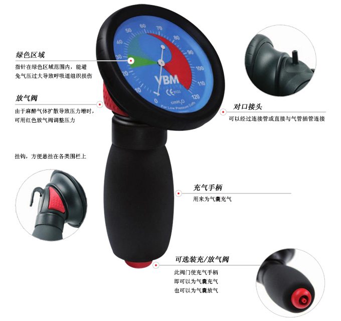 ▲由于氣囊長時(shí)間連接著氣管導(dǎo)管,測(cè)壓表可用來監(jiān)測(cè)和通過紅色的壓力釋放閥來調(diào)整壓力值在正常范圍。