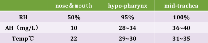 用鼻子呼吸時(shí),吸到隆突上方的氣體已經(jīng)被加熱到接近 36°C ,加濕到含水量 80% 到90% 。氣道各個(gè)部位的溫度、濕度生理參考值見下圖