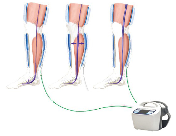 ②圓周壓力:通過充氣腿套對(duì)腿部進(jìn)行圓周壓力,有效清除靜脈瓣后血液瘀積;