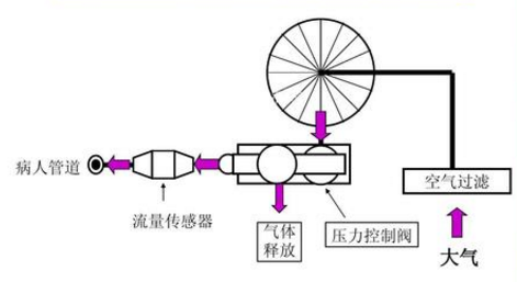 流量傳感器將測量到的實際值饋送到電子控制部分與面板設置值比較,利用兩者間的誤差控制伺服閥門來調節(jié)吸入和呼出氣體流量;